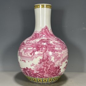 古玩古董瓷器旧货老物件收藏大清乾隆年制胭脂红山水图纹天球瓶