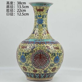 清乾隆黄地粉彩缠枝莲纹手绘赏瓶官窑花瓶瓷器旧货老货收藏摆件