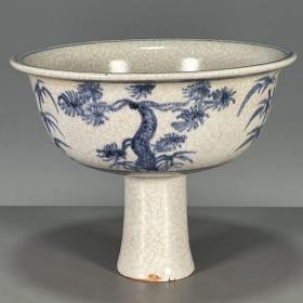 古董古玩老货旧货瓷器收藏 老窑老胎青花开片松树高脚碗