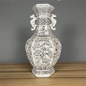 清王炳荣款雕刻花鸟六方双耳瓶古董瓷器旧瓷器老物件旧货老货收藏