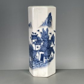 古董瓷器古玩旧货收藏 大清光绪年制青花风景江南水乡六棱笔筒