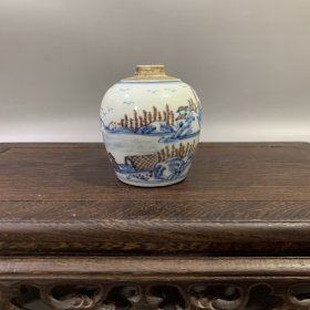 清代青花釉里红山水小罐,老货旧货收藏,完整精品
