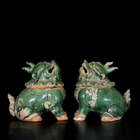 宋当阳峪窑绞胎绿釉瑞兽17x14厘米