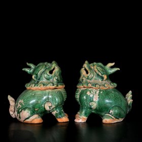 宋当阳峪窑绞胎绿釉瑞兽17x14厘米