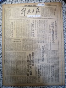 解放日报1943年太行救济灾荒减轻民负豁免公粮晋冀鲁豫边府工作人员每日开荒,晋西北静乐民兵临难不苟可歌可泣,敌寇在山西疯狂进行抢粮,边府建设厅发出详细指示选举劳动英雄和模范生产工作者,绥德专署指示各县选举今年劳动英雄,盐堆上出状元—记合作运盐英雄刘永祥,山东的整风学习,盐池驻军的耕牛运输队,吴伯箫丰饶的战斗的南泥湾,仓夷《连长回来了》杨茂盛我学文化的经过。1954年原样影印1-4版裁开,4开内容全