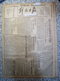 解放日报1943年陕甘宁边区劳动英雄模范生产工作者代表题名录,西北局欢迎劳动英雄,劳动群众代表向西北人民领袖高岗同志献旗,高岗同志号召,南斯拉夫解放军决定成立临时政府,贯彻毛泽东同志文艺方向延安各剧团下乡工作西北局办公厅召开欢送大会柯仲平代表答词,米脂县委《米脂民丰区三乡的减租斗争》三边劳动英雄大会生产展览会,王德清《全连公认的模范刘平》如何养羊和发展羊,1954年原样影印1-4版裁开,4开内容全
