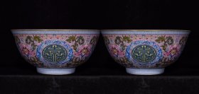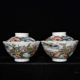清雍正御制粉彩落花流水缸杯一对
