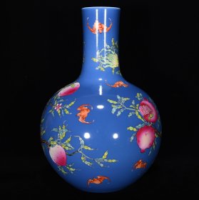 清雍正蓝地粉彩福寿三多纹天球瓶