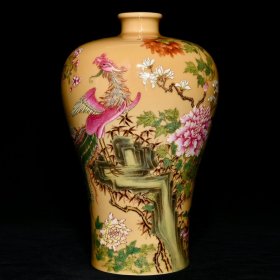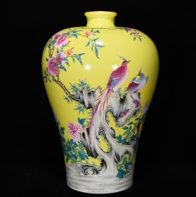 清雍正米黄釉粉彩花鸟纹梅瓶