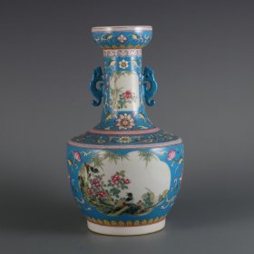 清雍正年制蓝地粉彩开窗竹雀纹双耳瓶