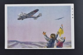 (庚3726)史料《仰ぐ银翼》明信片1张 绘叶书 图为头戴狗皮帽手举伪满洲国旗的少年对日本战机高举双手 伪满洲国粉饰日本侵略的宣传画 陆军恤兵部发行 小林又七印行 尺寸 14.2*8.2CM