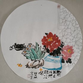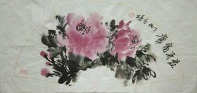 书画名家笔墨真迹 著名禅意书画家贾双林早期扇面花鸟作品:富贵花开