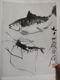 散页美术资料(印刷品)—————书画-——齐白石作品选【鱼虾图,群虾图,群鸡图,红梅书法,君子图书法】○花鸟扇面【张大千】2127