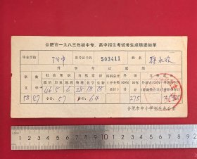 1983年合肥初中专高中招生考试考生成绩通知单,合肥市第三十四中学考生成绩单,加盖合肥市中小学招生办公室章,合肥34中校史资料、合肥义务教育老资料