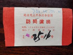 (珍品)1966年越南共和国杂技团在广西军区礼堂演出门票。1966年,越南共和国杂技团第一次访华,也是唯一一次访华。访华期间,在广西进行了演出。演出票场地、时间信息完整,保存良好,值得珍藏。