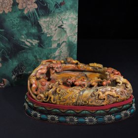 典藏珍品 珍藏寿山石浮雕螭龙献福笔洗摆件,净长29.5厘米宽17厘米高6.5厘米,净重2478克,价格11000元,搭配布盒与底座,代理加价,运费自理!