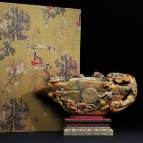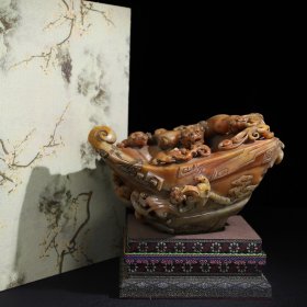 典藏珍品 珍藏寿山石浮雕九龙杯摆件,净长33厘米宽12.5厘米高14厘米,净重4020克,价格11000元,搭配布盒与底座,代理加价,运费自理!