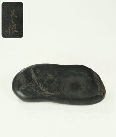 旧藏 坑仔料 歙砚: 砚石色泽沉稳,隐约中有绸缎般折光,石质莹润,颇为难得。细刷丝罗纹清晰,池头细琢精细,砚堂右侧刻铭。 尺寸:长12.1cm,宽8.5cm,厚1.8cm,重356.5g