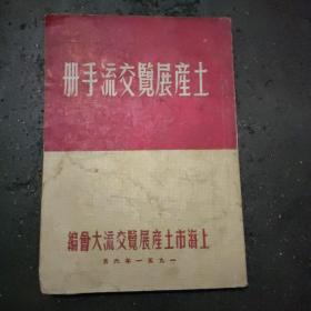 《土产展览交流手册》 本书1951年出版,详细介绍上海市土产展览交流盛况,插图有毛主席像、国徽、及国家领导人题辞,插图广告众多,是当时重要资料,书角有损。