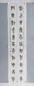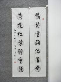 B9801号书法对联 鹤发童颜添百寿 黄花红叶醉重阳 138×34cm×2条 作者:杨责俊 山西省 晋榆 晋中市老年书画研究会 第三届全国中老年创新书画大赛获奖