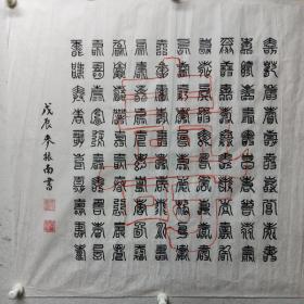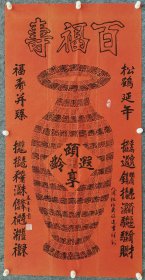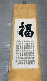 刘焕章书法百福图,立轴纸本绫裱,全本尺寸:178x65,画芯尺寸:109x48,五福捧寿纹带工青花瓷轴头,一侧轴头背面装裱纸略有开裂,因年代关系正面背面均呈现不同程度的黄金斑,整体品相比较完好。