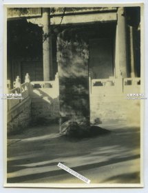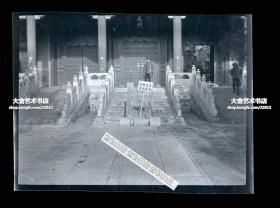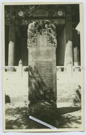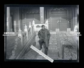 1945年-1946年美国大兵在北京国子监孔庙大成门台阶前留影老照片底片一张。6X4.5厘米。当时大成门前丹陛石附近有“保护石雕,请走两旁”的标志牌,看来四十年代就有保护石雕文物的意识了。