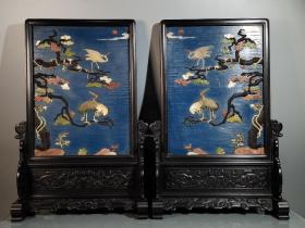 紫檀木高浮雕龙纹彩绘描金漆器镶嵌多宝松鹤延年屏风一对【61号】 单个尺寸:长40厘米 宽18厘米 高59厘米,一对总重6.5公斤