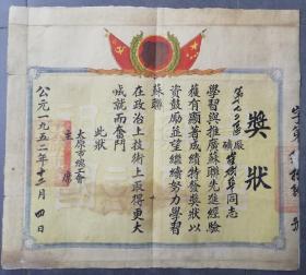 1952年山西省太原市总工会颁发奖状,奖绐第172区矿厂职工崔某学习推广苏联先进经验获得显著成绩,两巨头侧面像少见,时代特征明显,奖状后有老粘托,品相略欠,慎拍