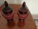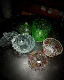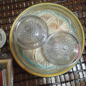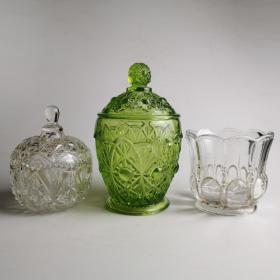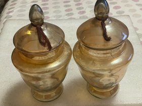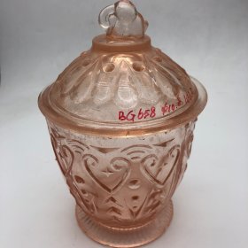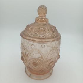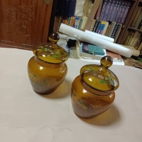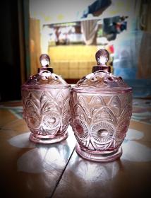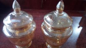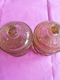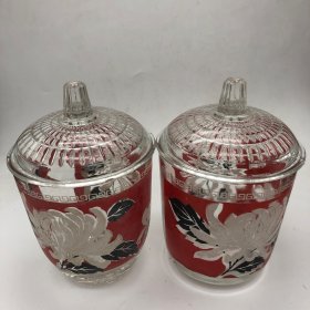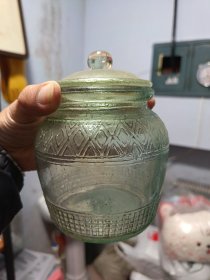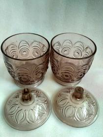 70年代婚嫁菊花纹玻璃糖罐一对,口径11厘米,全高17厘米,合重3斤,做工细腻,图案古朴、罐体厚重,时代特征明显,盖边缘有点毛边(见图),2只罐底足有不同(见图)整体保存完好(品如图)BG387