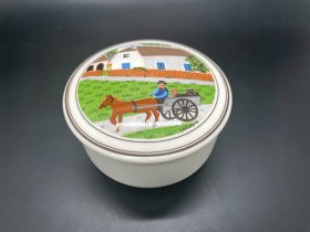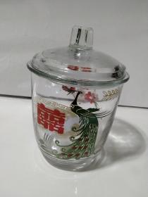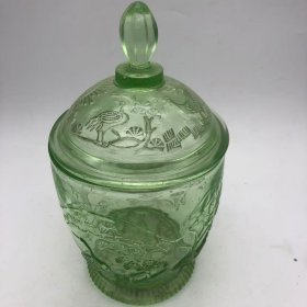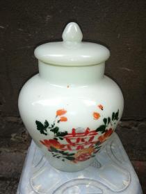 50年代雄鸡一唱天下白玻璃糖罐,口径10.3厘米,全高20厘米,图案古朴、罐体厚重,太阳、雄鸡,仙鹤,时代特征明显,全品(品如图)BG027