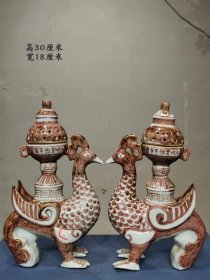 旧藏.款识“大明宣德年制”精品釉里红古瓷,朱雀尊式熏炉摆件一对