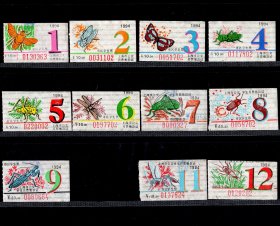 [ZH-05]上海市公交市区学生月票缴款证10.00元-12.50元/1994年11种(缺10月/装饰画各类昆虫图案)0363/背无揭薄/选购1张5元,5.3X3.4厘米。