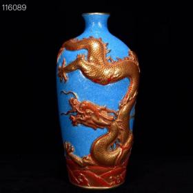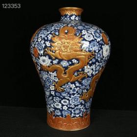 清乾隆青花浮雕矾红描金龙纹梅瓶,
