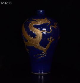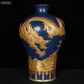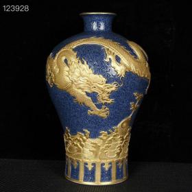清乾隆宝石蓝釉鎏金雕刻龙纹梅瓶