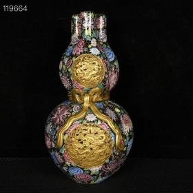 清乾隆乌金釉珐琅彩鎏金雕刻镂空云龙纹三管葫芦瓶a