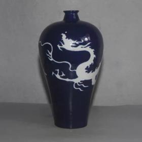 元霁蓝留白刻龙纹梅瓶,