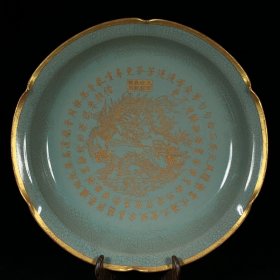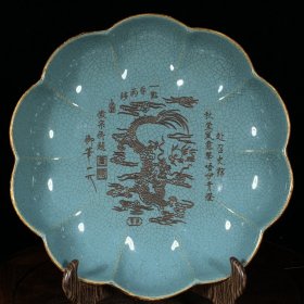 宋汝窑包口铭文刻龙凤纹花口盘,高6厘米直径30厘米