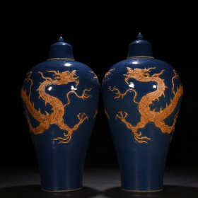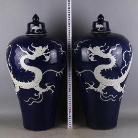 元代霁蓝留白雕刻龙纹梅瓶一对