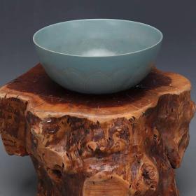 汝窑天青釉内刻龙纹外刻莲花大碗