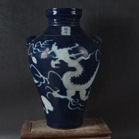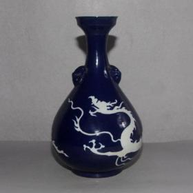 祭蓝留白刻龙纹双耳梅瓶