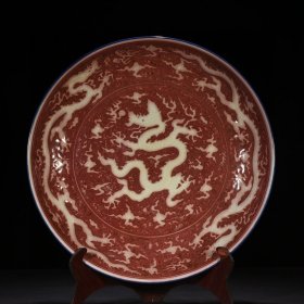 元祭蓝釉釉里红刻龙纹盘 8*48厘米