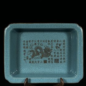 宋汝窑包口铭文刻龙纹四方洗 高4.5直径19厘米