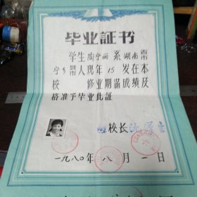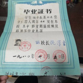 1980年奉贤县奉贤中学毕业证书 (有照片 有学校章 校长印 ) 校长程和