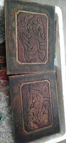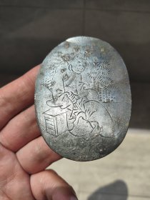 铜墨盒盖板和铜板合计2个,铜墨盒板上刻一古装人物依靠书箱,文气十足,年份是明清时期,5.4*7.2厘米。铜板刻中西,年份不详,2.3厘米。