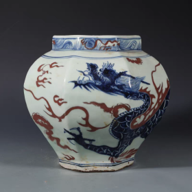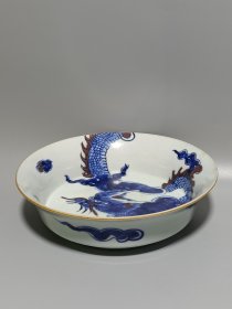 清代康熙年制青花釉里红龙纹盘,直径21.4cm,高6cm。盘身绘制精美龙纹,青花釉里红工艺精湛,云纹环绕,龙身鳞片清晰。底部有"大清康熙"款识,品相完好无瑕疵。适合收藏或装饰摆件,是清代瓷器中的精品。