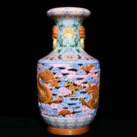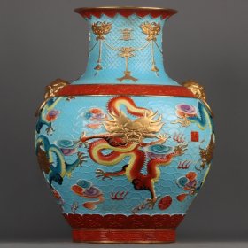 珐琅彩鎏金浮雕云龙纹兽耳瓶 高宽:49*36cm