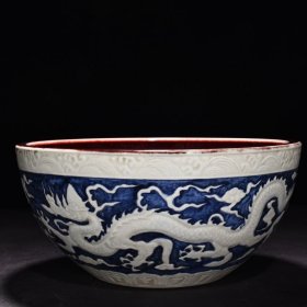 明宣德青花留白刻云龙纹内霁红釉钵洗