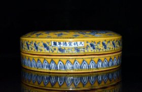 旧藏明代宣德黄釉青花云龙纹云龙纹圆圈果盒