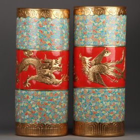 珐琅彩鎏金福寿云龙纹帽筒一对 高宽:54*23cm