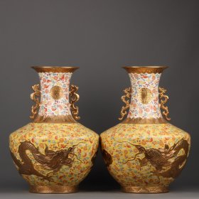 珐琅彩鎏金福寿云龙纹双耳瓶一对 高宽:46*31cm